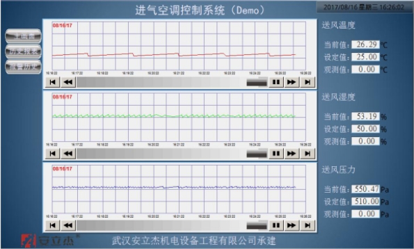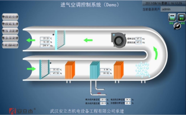 基于空气调节技术,我公司提出了进气空调的总体控制方法,即变风量、恒压、恒温恒湿空气调节方法。基于西门子S7-300系列PLC及其扩展模块和外围电气设备,设计了拥有自主知识产权的进气空调温湿度控制系统和进气压力控制系统的硬件电路及控制系统软件。