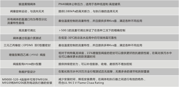 VG1000系列螺纹连接球阀用于调节暖通空调系统中热水、冷水和低压蒸汽的流量。整个VG1000系列锻造黄铜球阀可以和江森自控VA9104、M9106、M9108、M9109系列非弹簧复位电动执行器以及VA2202、M9206、M9216系列弹簧复位电动执行器,实现开关、浮点或者比例模拟控制。